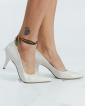 Palmilha: 4 mm de espessura, espuma em EVA, revestida em Napa Verniz Off White e Taloneira Napa Nude com a logomarca Arrasadora;